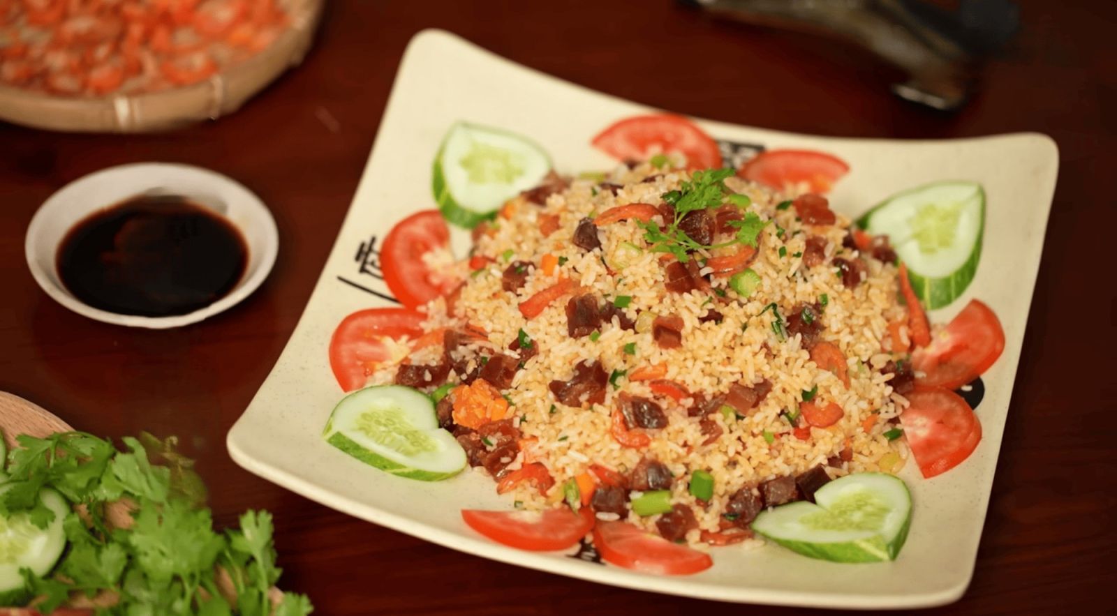 Món cơm chiên lạp vịt gốc Hoa gây ấn tượng bởi vị béo mặn hài hòa, hạt cơm tơi săn và mùi thơm rõ rệt từ lạp vịt.